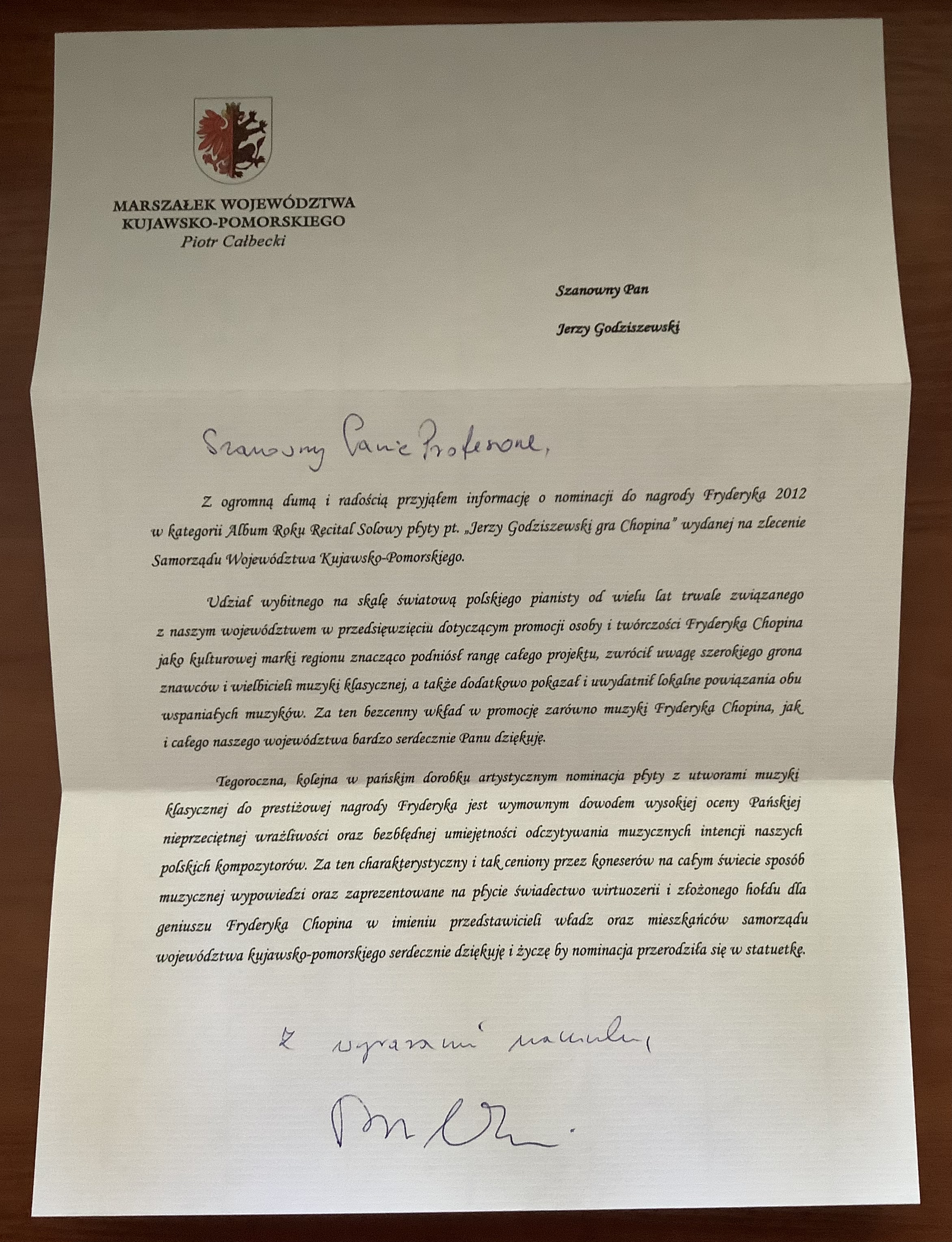 Gratulacje dla Jerzego Godziszewskiego za nominację do Nagrody Akademii Fonograficznej Fryderyk 2012 od Marszałka Województwa Kujawsko-Pomorskiego Piotra Cełbeckiego.